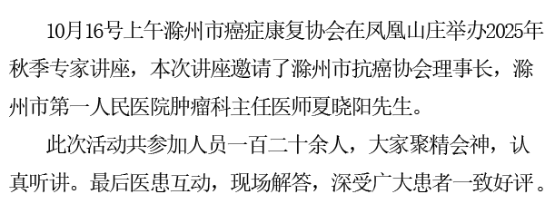 滁州市癌症康复协会开展《癌症患者康复健康管理》讲座 您的浏览器不支持 video 标签。 滁州市抗癌协会理事长,滁州市第一人民医院肿瘤科主任医师夏晓阳在为大家认真讲课。 夏主任现场互动为大家解答咨询。 全体会员认真听讲。深受欢迎。 您的浏览器不支持 video 标签。 活动在快乐的氛围中圆满结束。2025-10-19 21:31:21 浏览人次: 119[关闭]